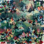 Having discovered a new-found direction in my paintings, I began to release the energy into several canvases with more fervour than previously, integrating foreground bursts of swirls against a backdrop of deep forest-green hues.